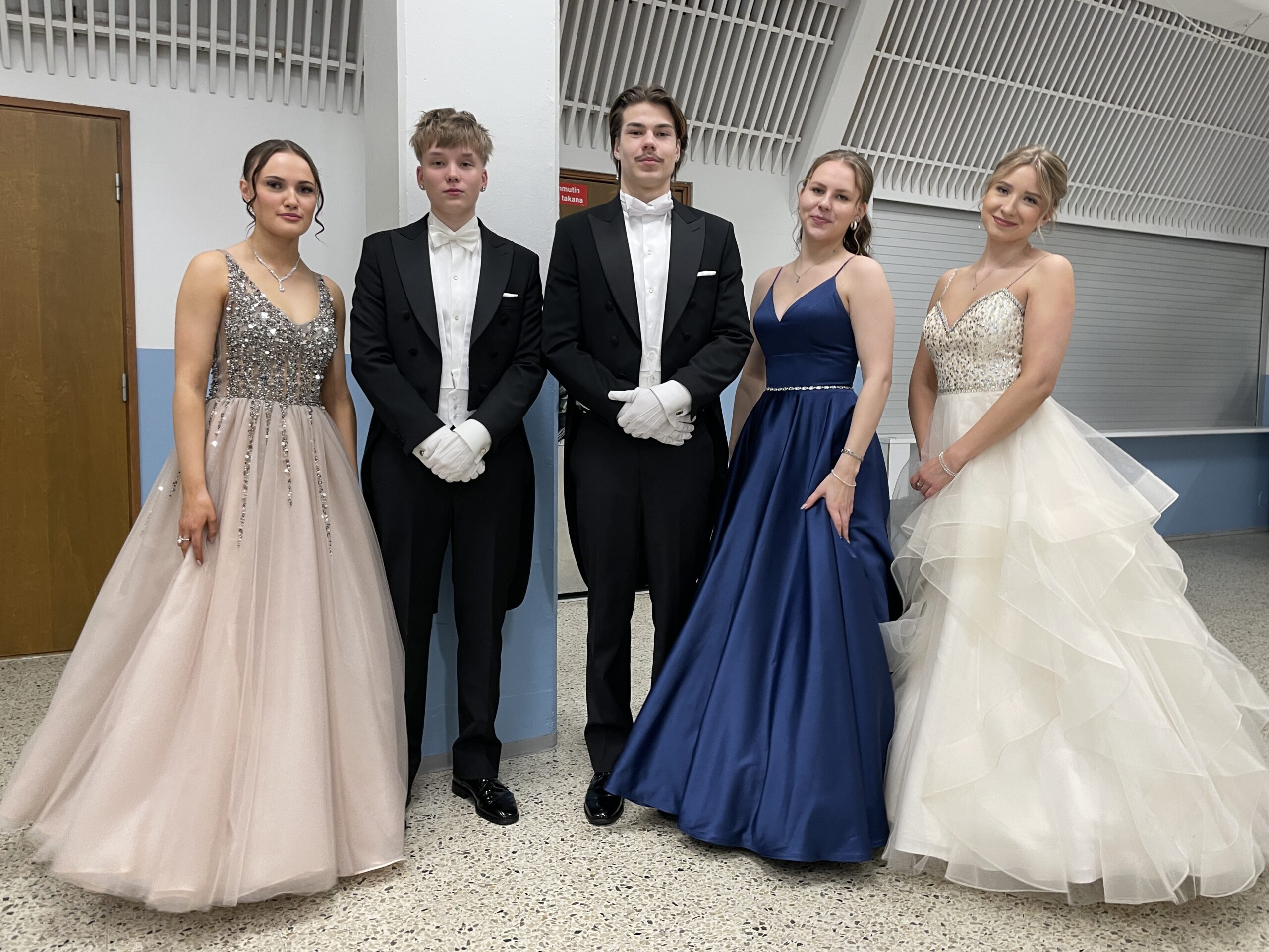 - Emmiina Valkeisenmäki, Eveliina Turpeinen, Aaro Kankainen, Kaisa Jämsen ja Tea Pakkala valmiina tanssin pyörteisiin.