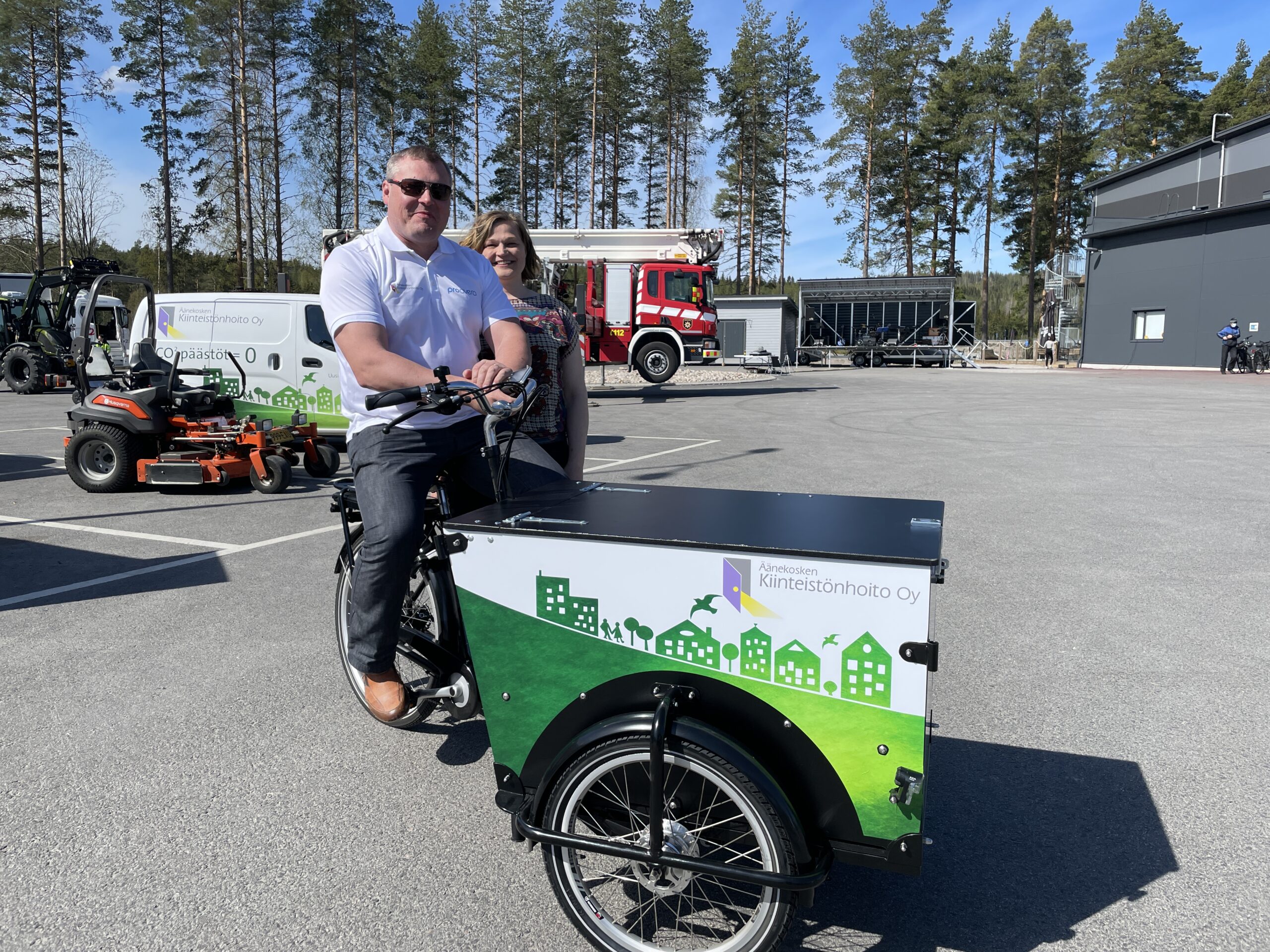 - Kiinteistönhoito korvaa yhden pakettiauton kahdella sähköavusteisella pyörällä. Toimitusjohtaja Antti Virmanen näyttää mallia ajoyylistä ja Vihreä Uusiutuva Äänekosken Sirpa Kortelainen peukuttaa kun dieselin käyttö vähentyy.