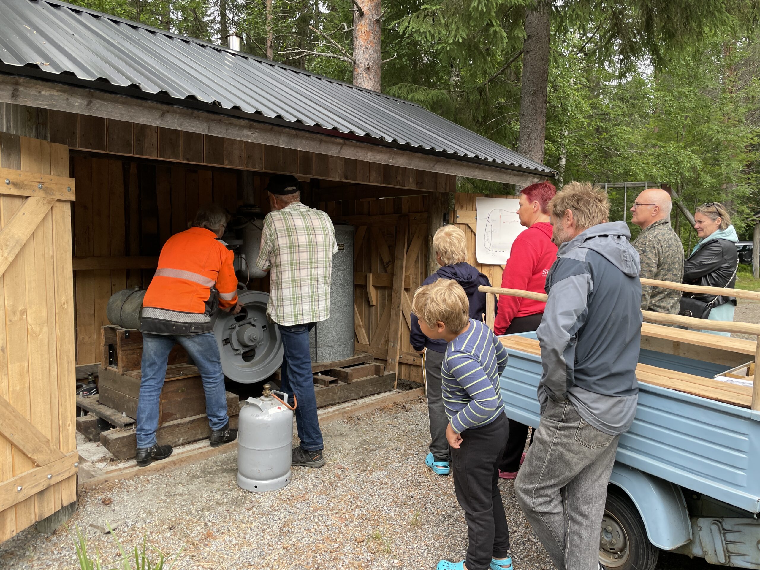 Kyläyhdistyksen Timo Boman kierrätti katsomassa Köyhyydenkylän nähtävyyksiä. Ennen kierrosta hörpättiin kupposet kahvia vastaleivotun ruisleivän kera. Ensimmäiseksi suunnistettiin uuteen pytinkiin, punaiseen hirsitaloon, joka on siirretty uudelle sijalleen Äänekoskelta.