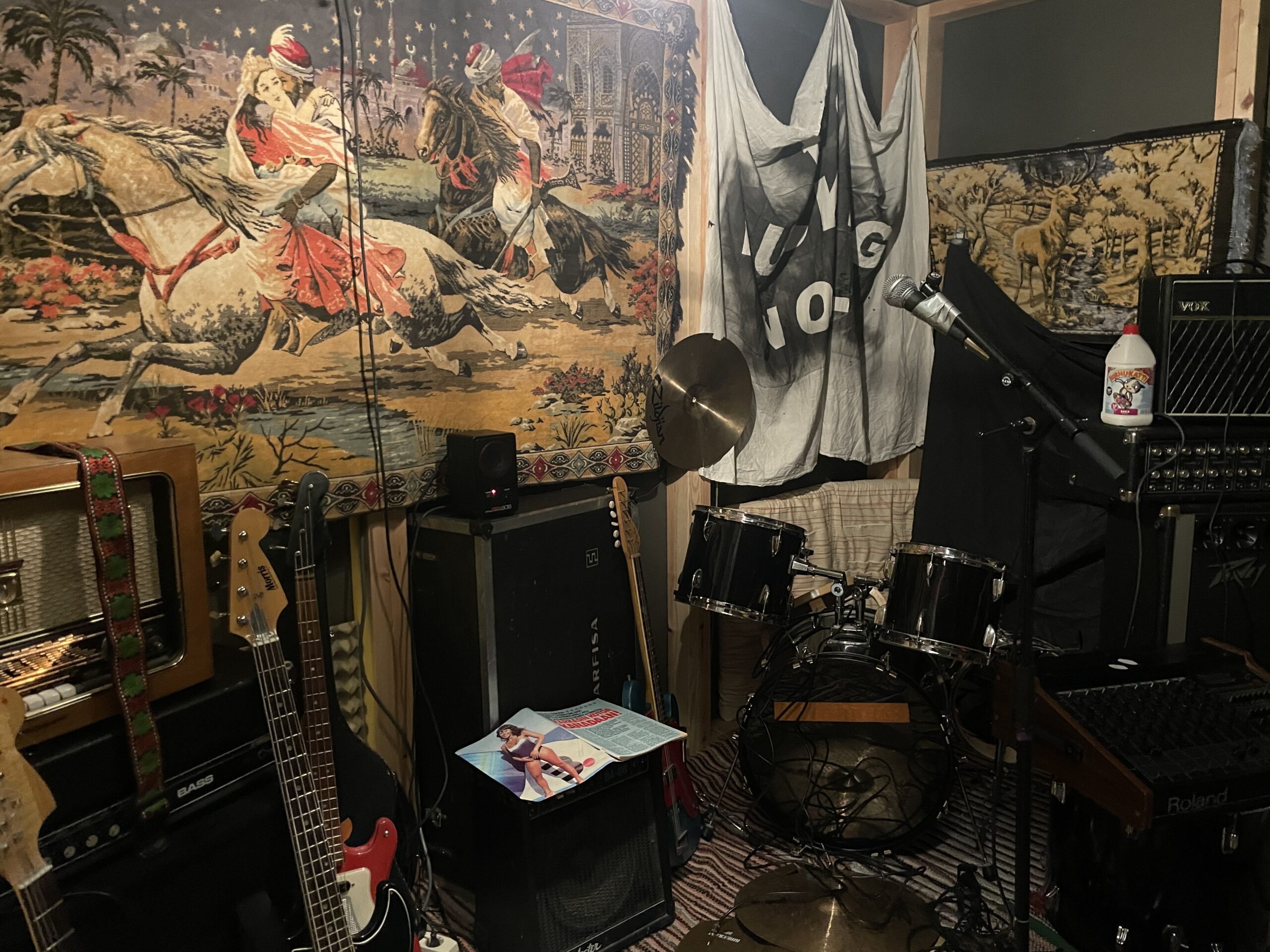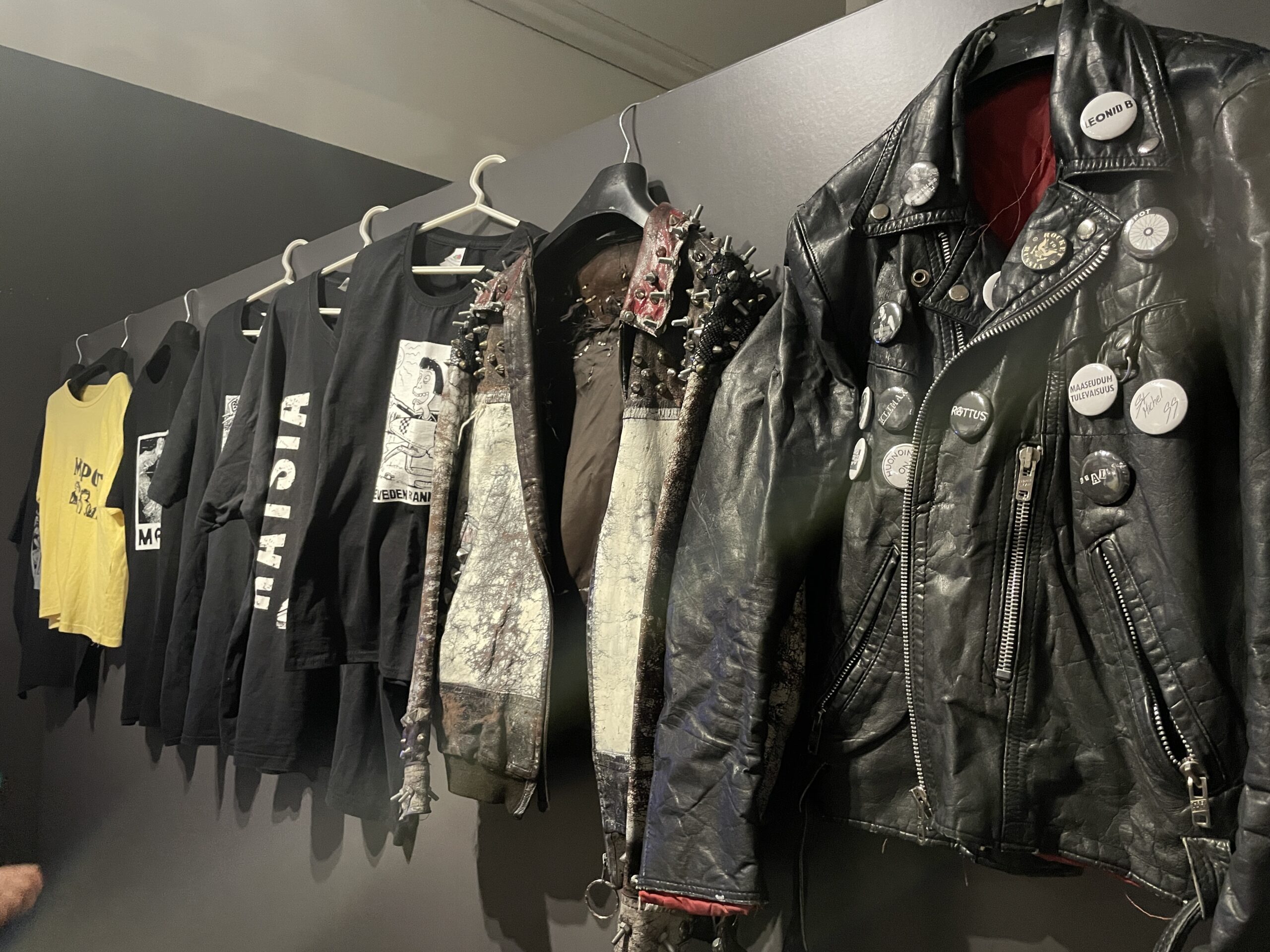- Oikealla Jouni Keräsen nahkarotsi sekä tuttuja bändipaitoja menneestä.