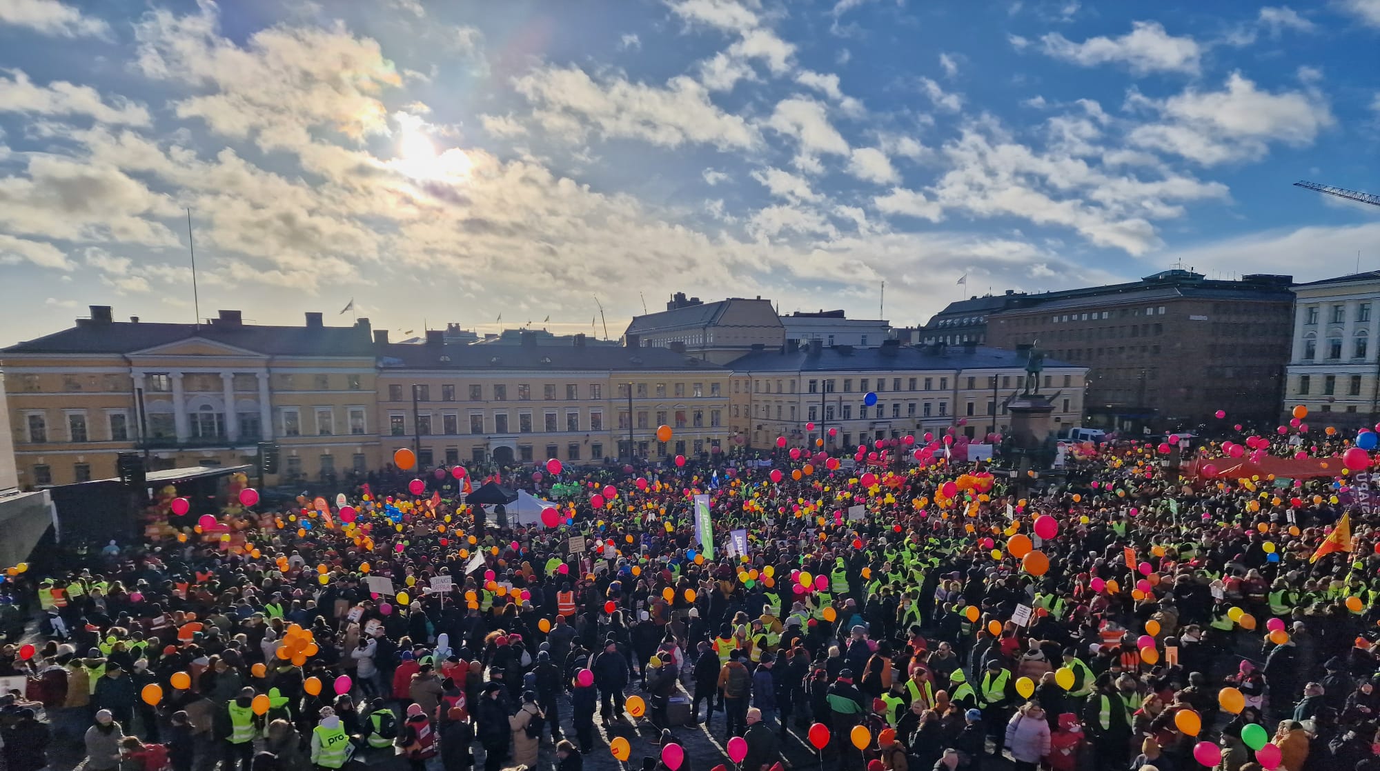 STOP nyt! – hallituksen työmarkkinapoliittisia uudistuksia vastustava mielenosoitus täytti Senaatintorin Helsingissä. Mukana oli myös iso joukko äänekoskelaisia.