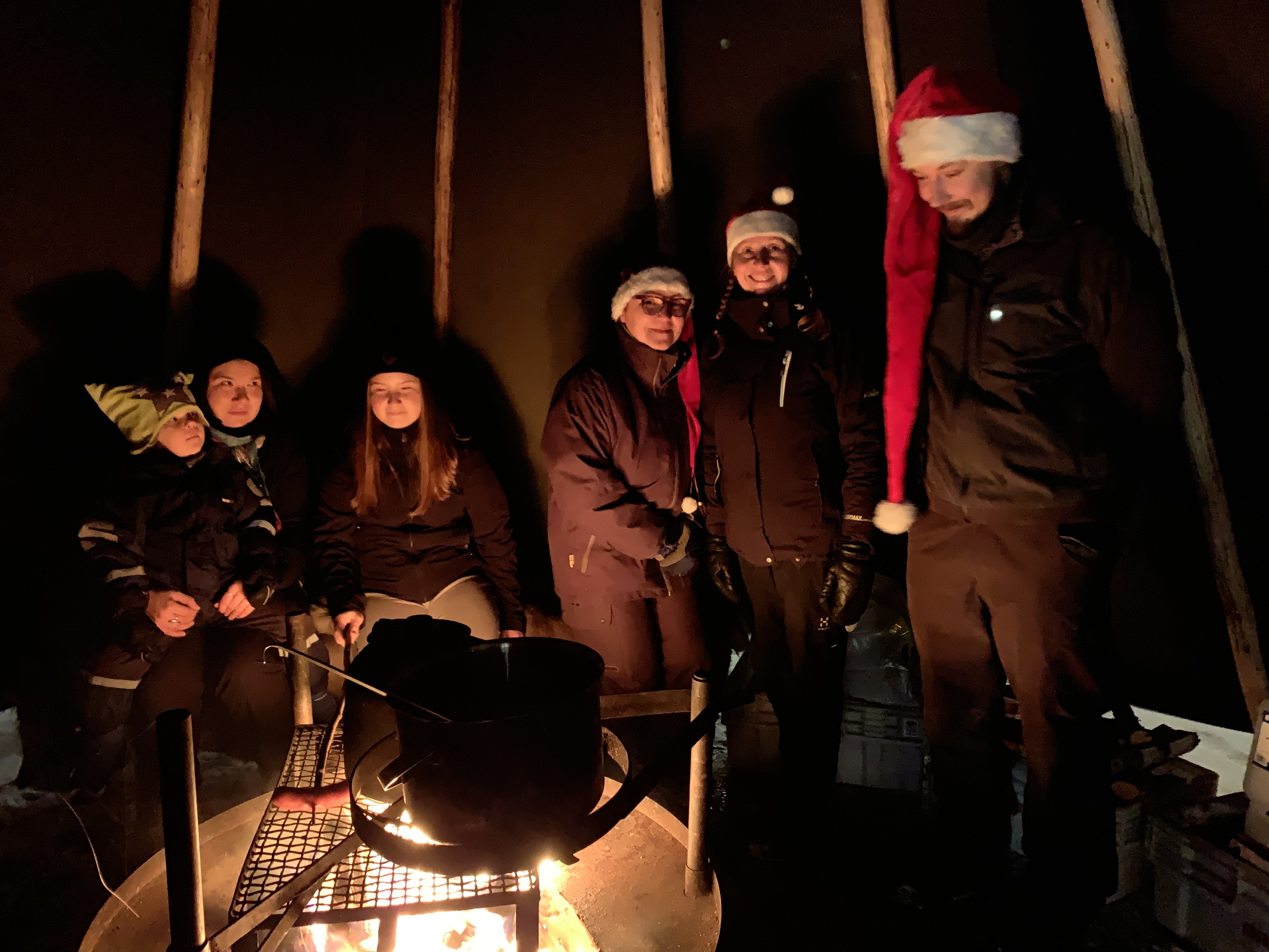 - Jose Piispanen (oik) Kirsi Marjo ja Tuula Kovanen opiskelevat POKElla luonto- ja eräoppaiksi. Kodassa oli tarjolla nokipannukahvia ja makkaraa.