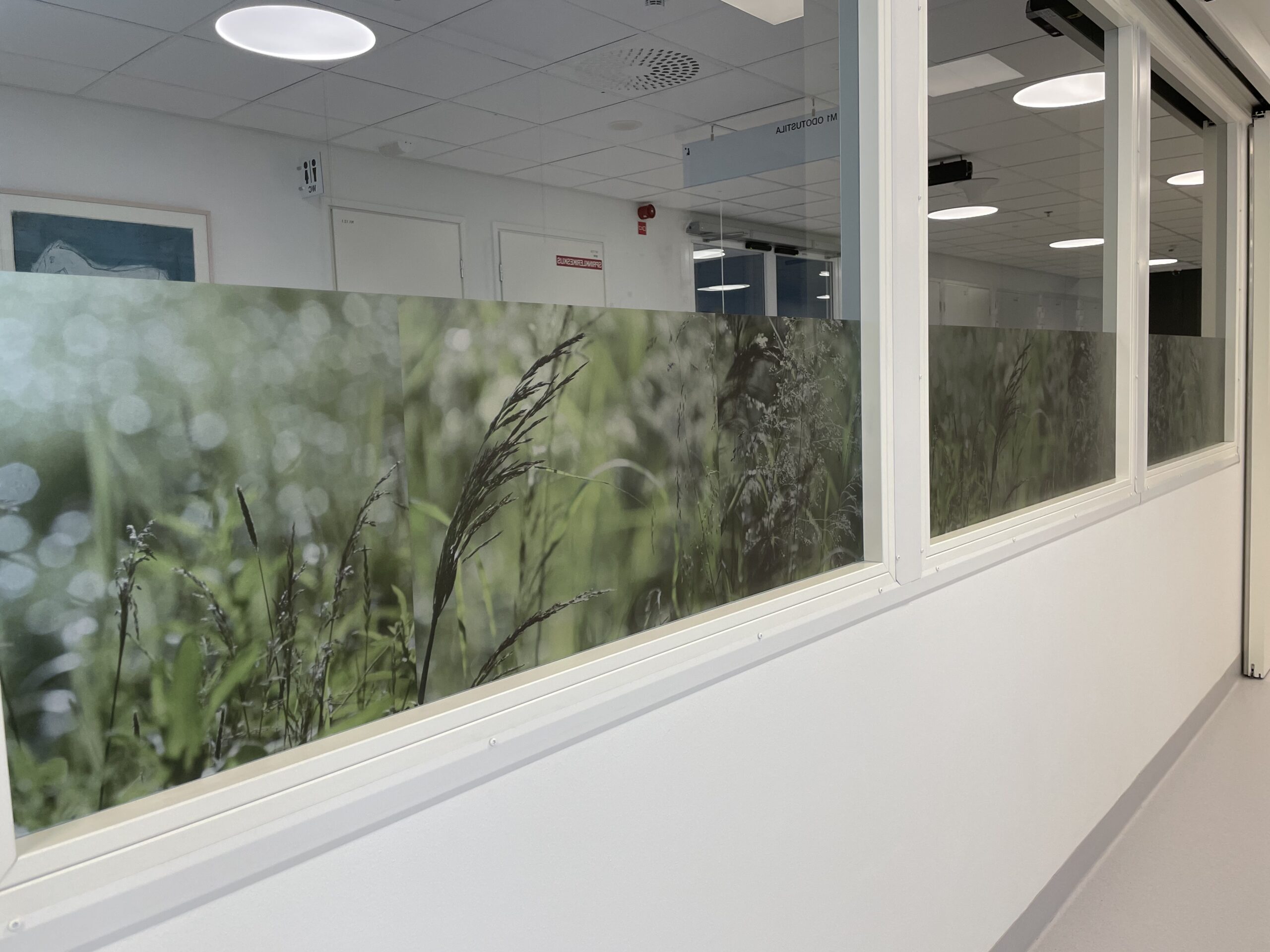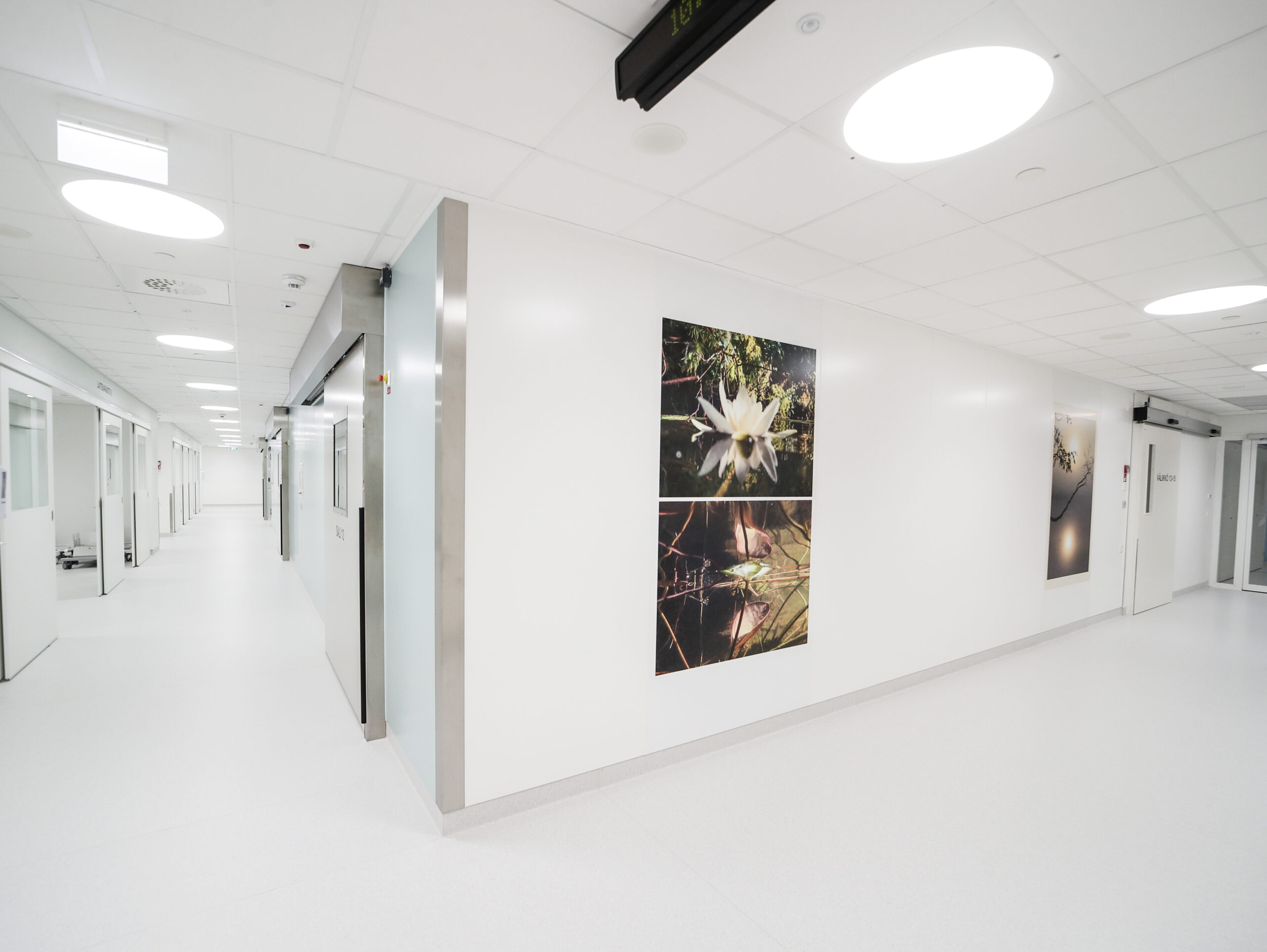 Leikkaussalin pitkän käytävän katseenvangitsijana toimii Jaana Kauton luontokuvat.