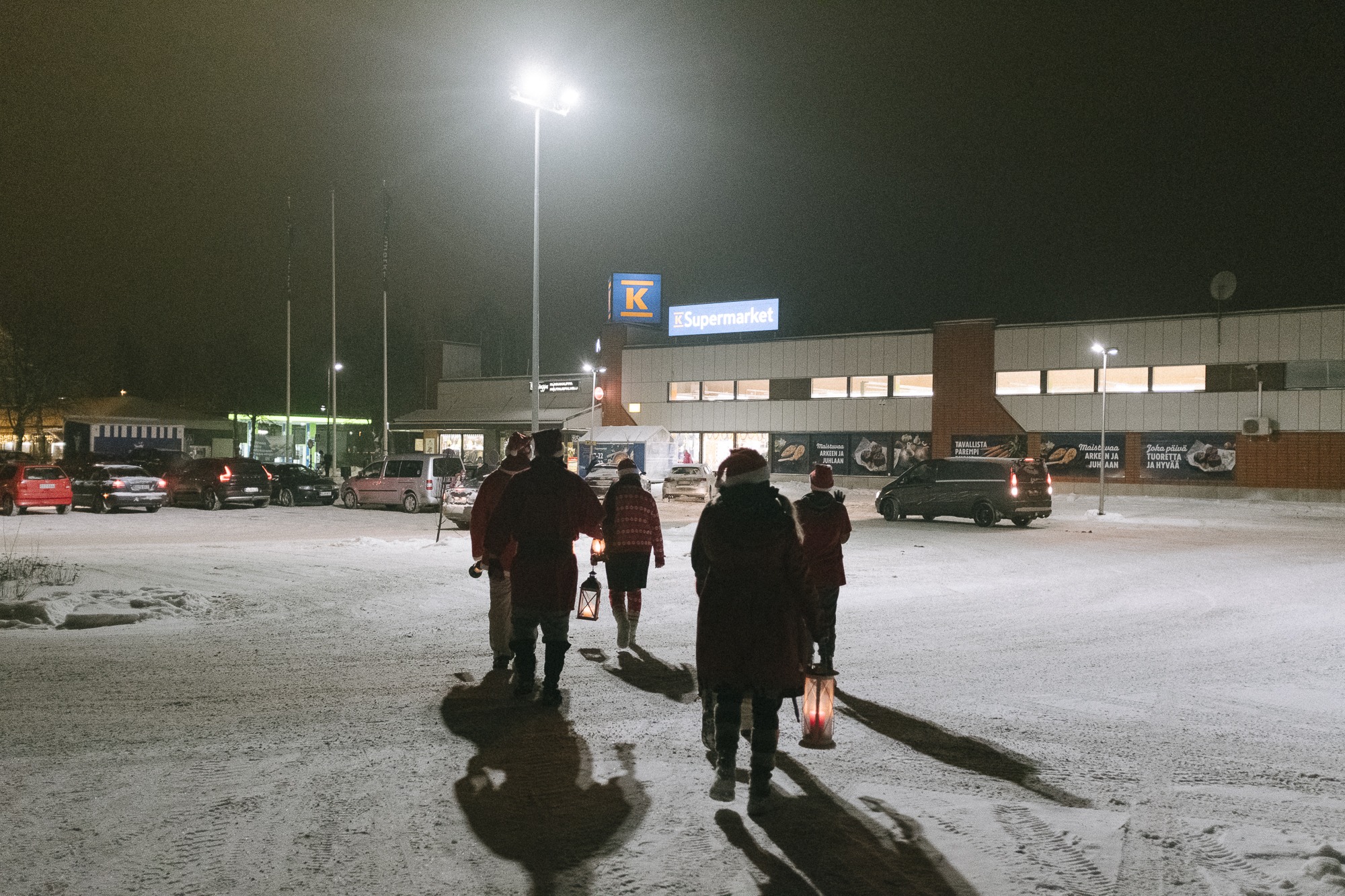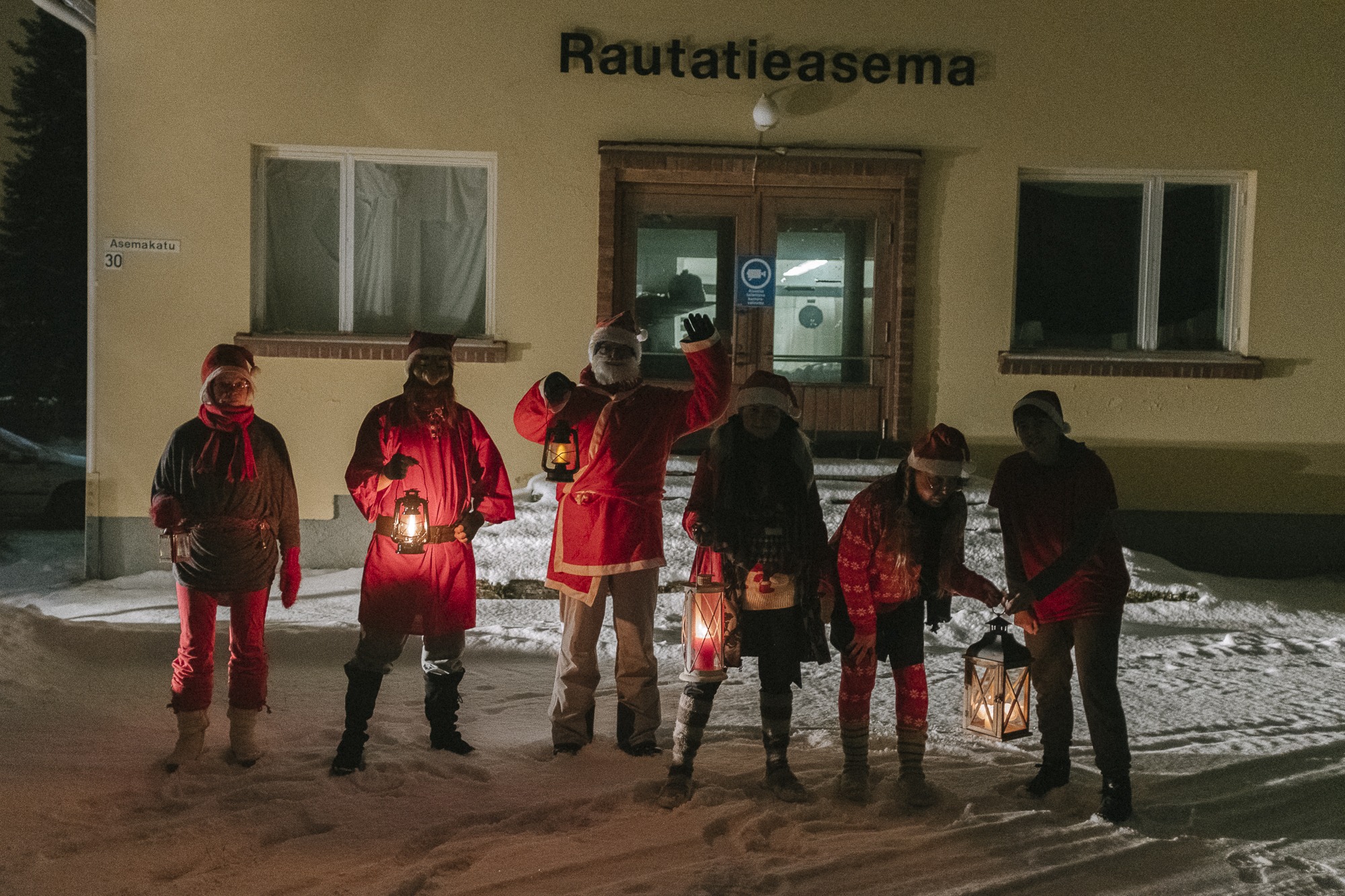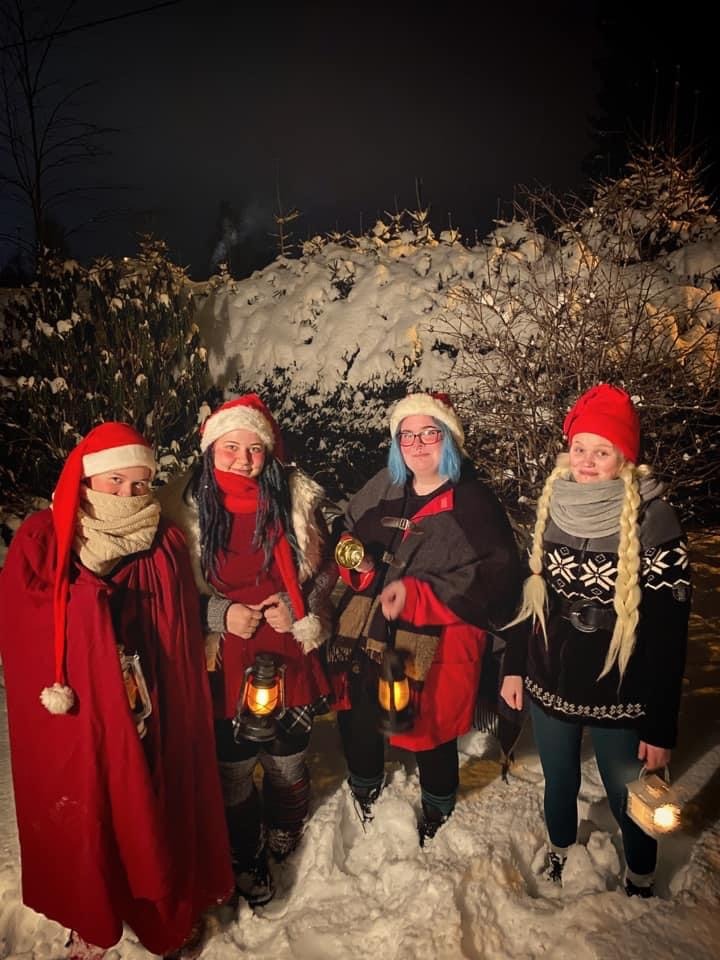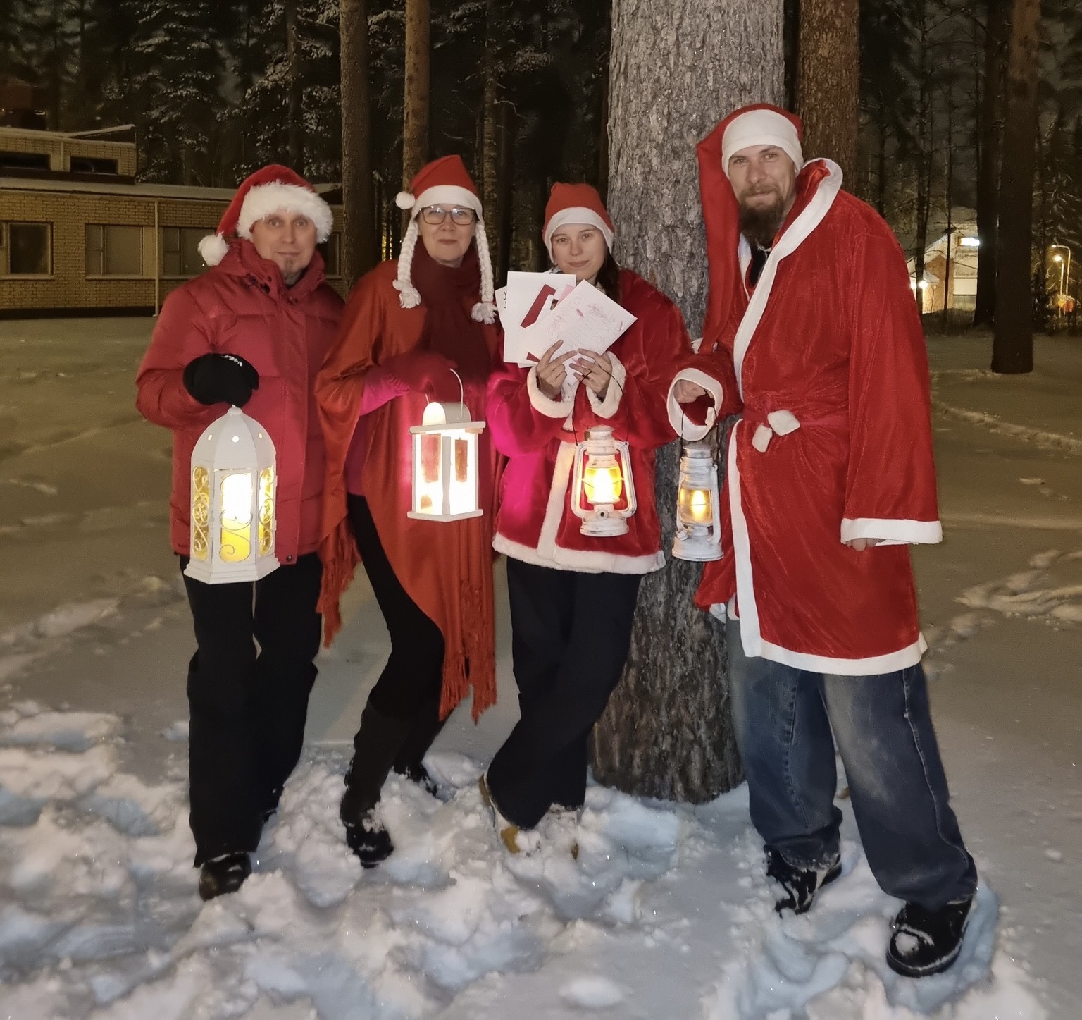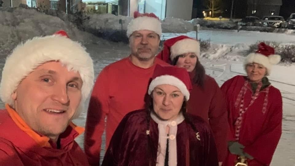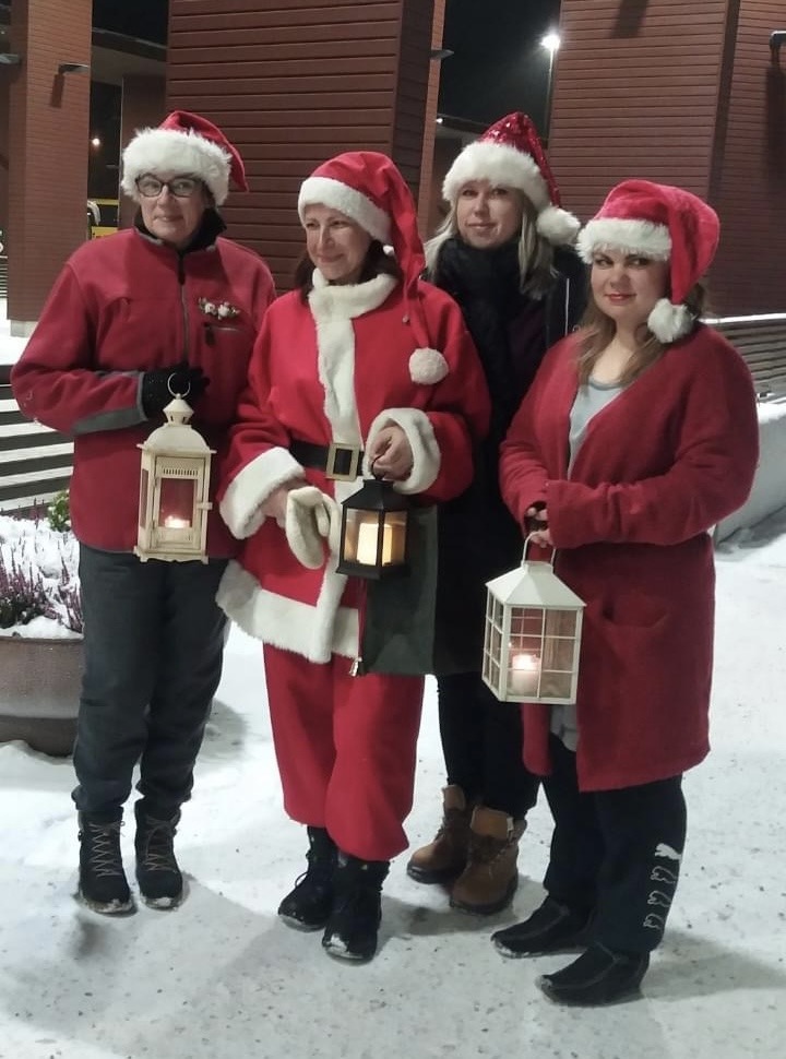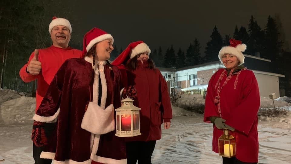 Korttitehtailijat pyysivät mukaan vielä muutaman kaverin lisää ja lähtivät seitsenpäisenä tonttujoukkona lyhdyt kädessä kiertelemään Äänekosken jouluisia katuja.