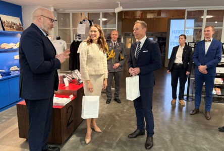 Matti Hintikka esitteli urheilumuseota presidentin puolisolle Suzanne Innes-Stubbille ja Islannin presidentin Halla Tómasdóttirin puolisolle Björn Skúlasonille. Kuva: Tahto